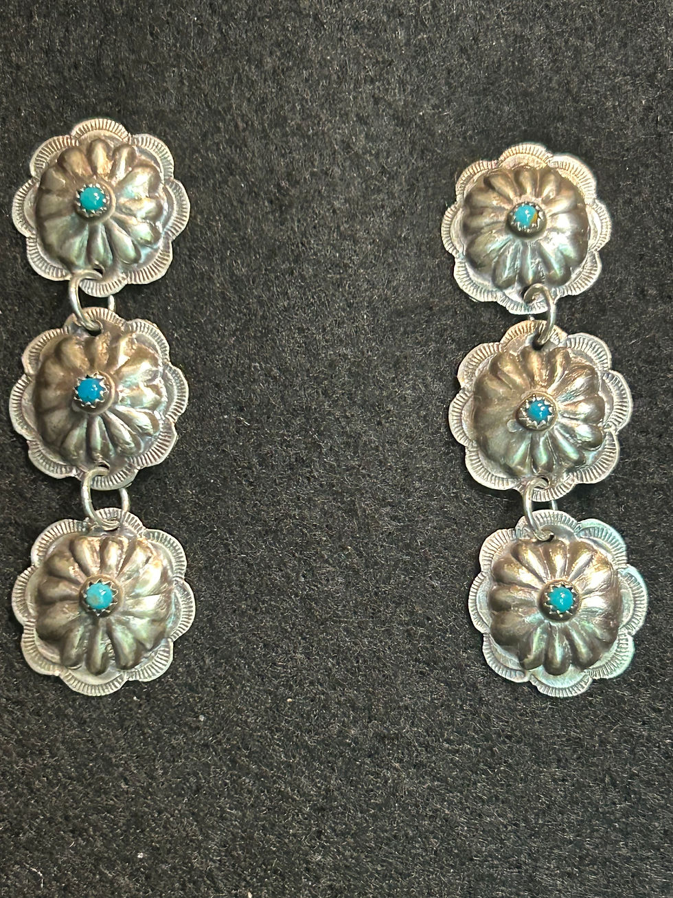 Handcrafted Triple Concho Turquoise Drop Earrings – Sterling Silver Western Jewelry