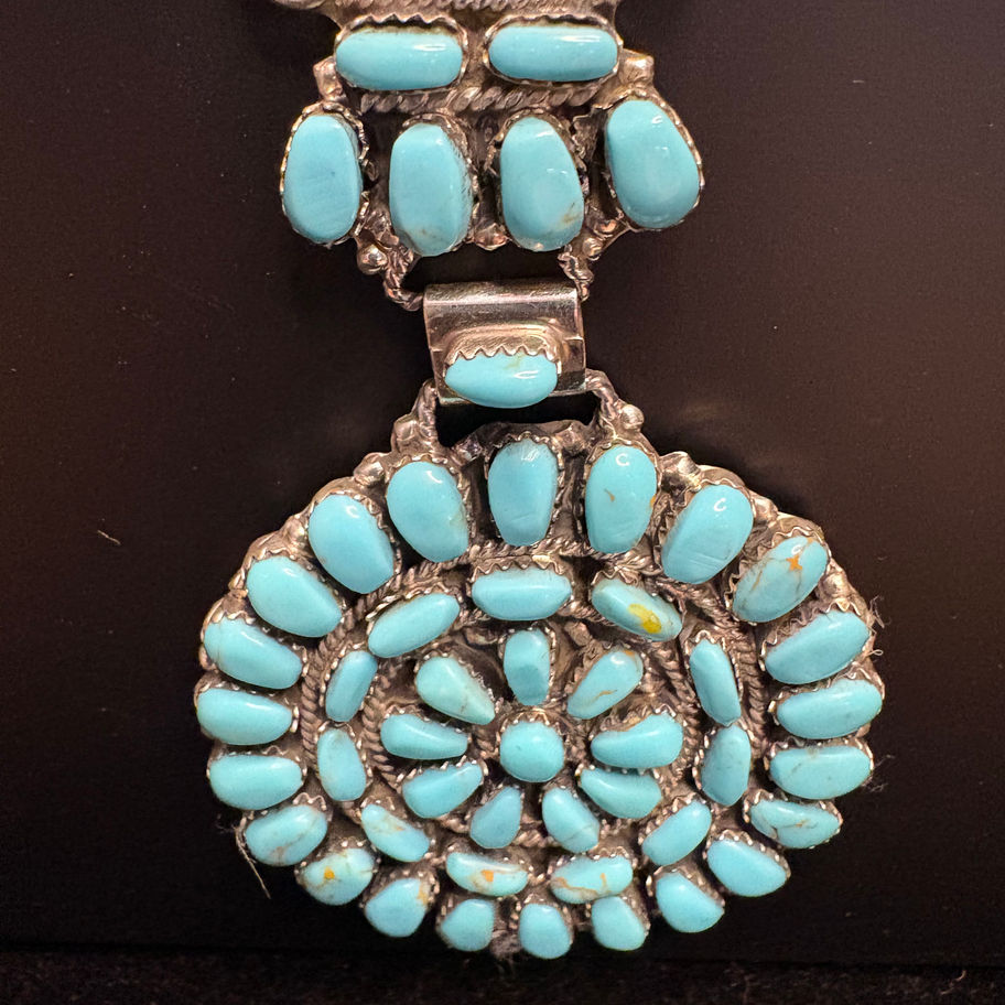 Step into the spotlight with this masterfully crafted sterling silver and turquoise cluster necklace by acclaimed Navajo artist Julianna William. This 51-gram treasure showcases a breathtaking array of natural turquoise cabochons, meticulously arranged in traditional clusterwork — a technique celebrated for its beauty, patience, and precision.
